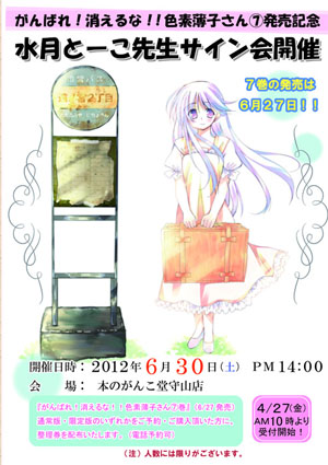 日本漫画家水月とーこ创作的少女爱情漫画《加油啊!别消失了!!色素薄子小姐》(《がんばれ!消えるな!!色素薄子さん》)单行本第7卷将于6月27日发售。而为了纪念这本单行本发行,水月とーこ将于6月30日在滋贺县本のがんこ堂守山店举行签名会。只要购买这本单行本的粉丝,均可通过电话预约报名参加。