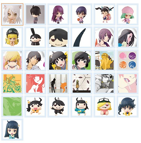 人气作家西尾维新的原作小说改编动画《化物语》及其续编《伪物语》的联合手办抽奖《一番签 化物语×伪物语》(眼镜厂BANPRESTO)奖签将于7月上旬在日本国内的LAWSON便利店发售。 抽签奖品有黑羽川、战场原黑仪、八九寺真宵等人气角色的2头身可爱迷你手办及挂件等商品。中奖率100%,一签600日元(≈48元),本次奖品十分丰富,有A-K共11个奖项。 A-G奖品是七个迷你手办,手办高约7~10厘米,全带底座。 A奖:阿良良木历、B奖:战场原黑仪、C奖:黑羽川、D奖:神原骏河、E奖:八九寺真宵、F奖:千石抚子、G奖:忍野忍。